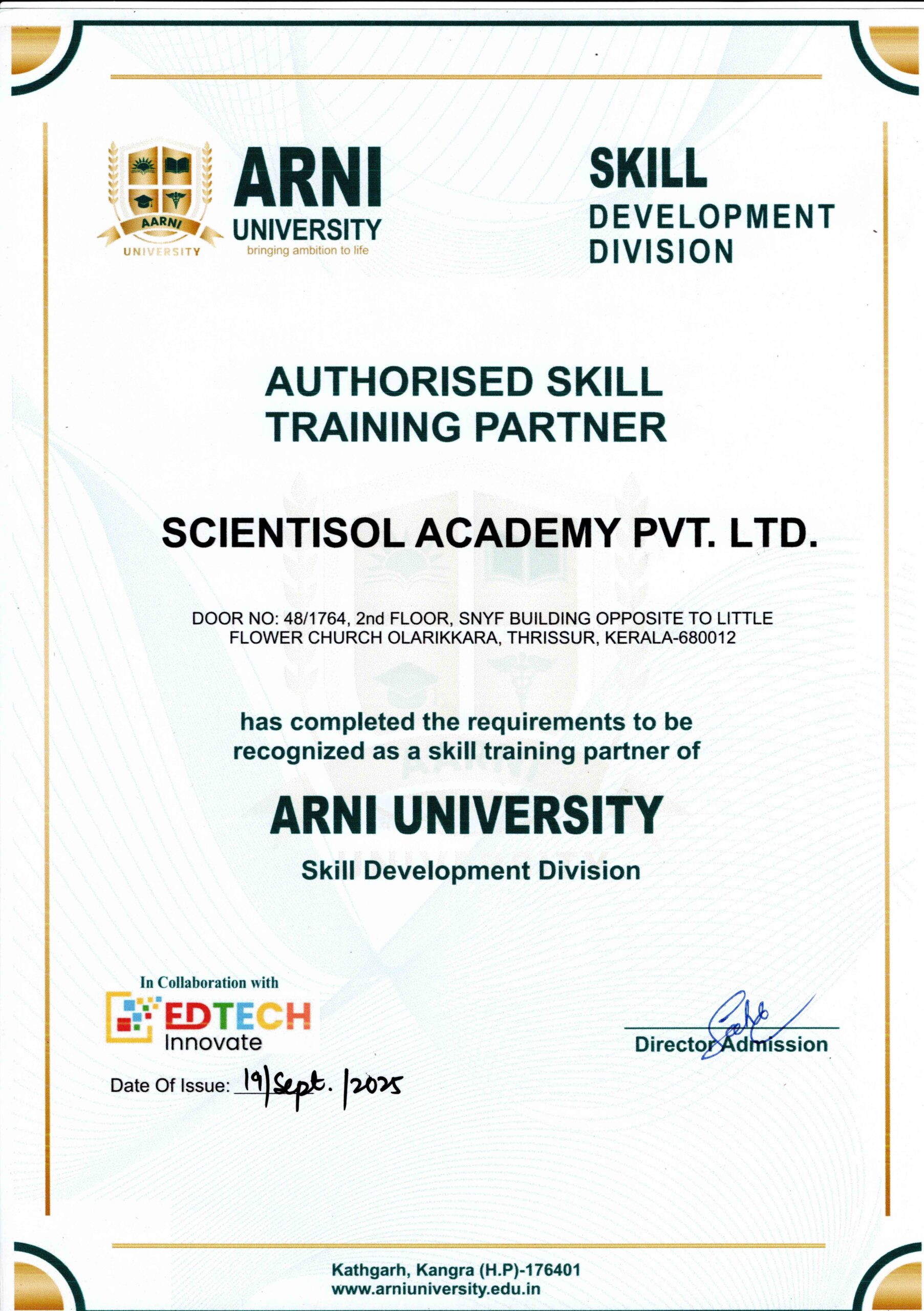 Scientisol Academy Private Limited is a government-registered institution under the Ministry of Corporate Affairs, India, committed to advancing health, nutrition, and wellness education across India and beyond. Our vision is to bridge the gap between modern science and traditional knowledge to create impactful, real-world health solutions.